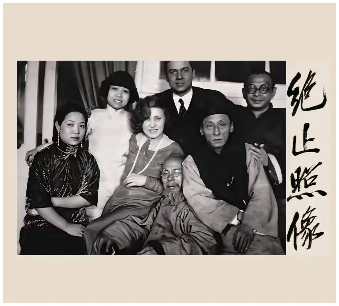 (左起)王怀英、孙克武、尼娜、齐蒂尔、齐白石、陈半丁、萧谦中,1931年,约3月12日晚,此照或为王仲年拍摄