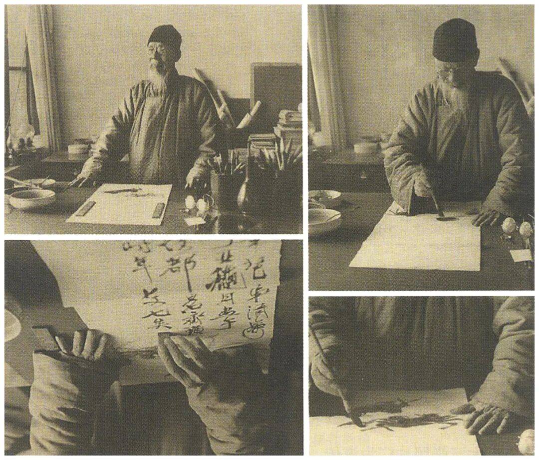 二、照片中透露出来的细节与其艺术风格息息相关。比如,从1930年代中早期拍摄的作画镜头中发现,齐白石凡画水墨则使用画案里侧,凡画设色则用外侧。