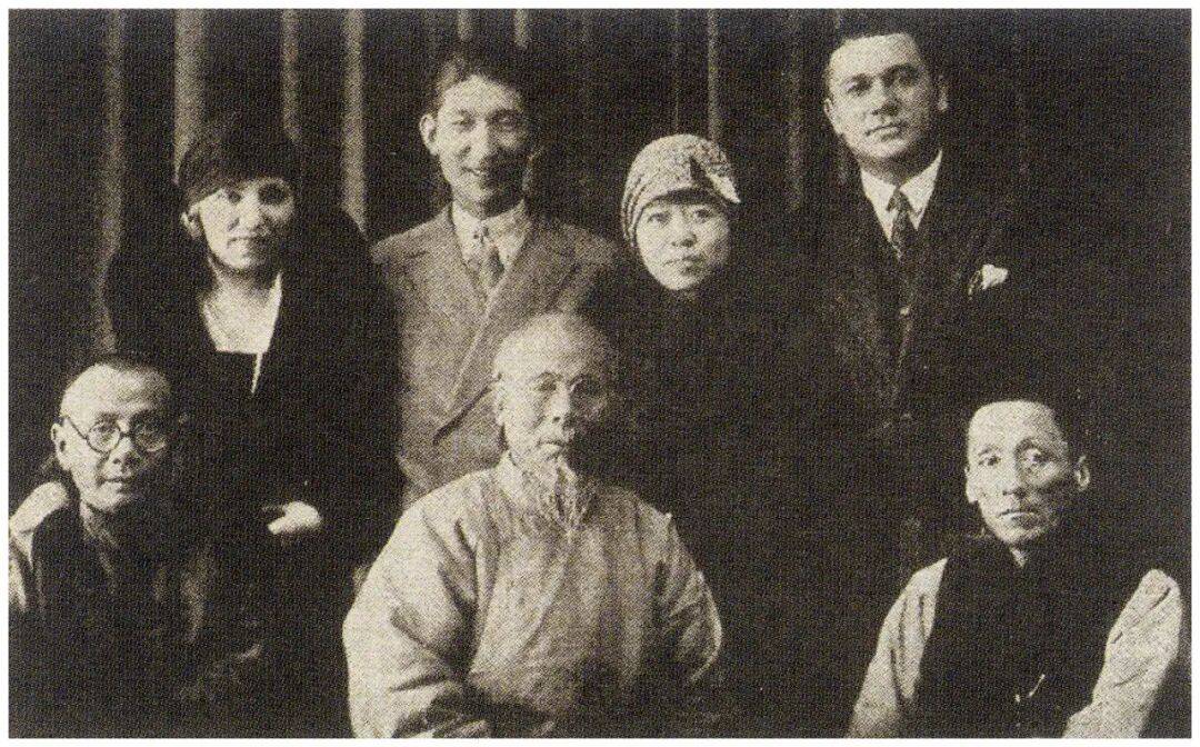 (左起)萧谦中、尼娜、王仲年、齐白石、孙克武、齐蒂尔、陈半丁,1931年,约3月12日晚,此照或为王怀英拍摄