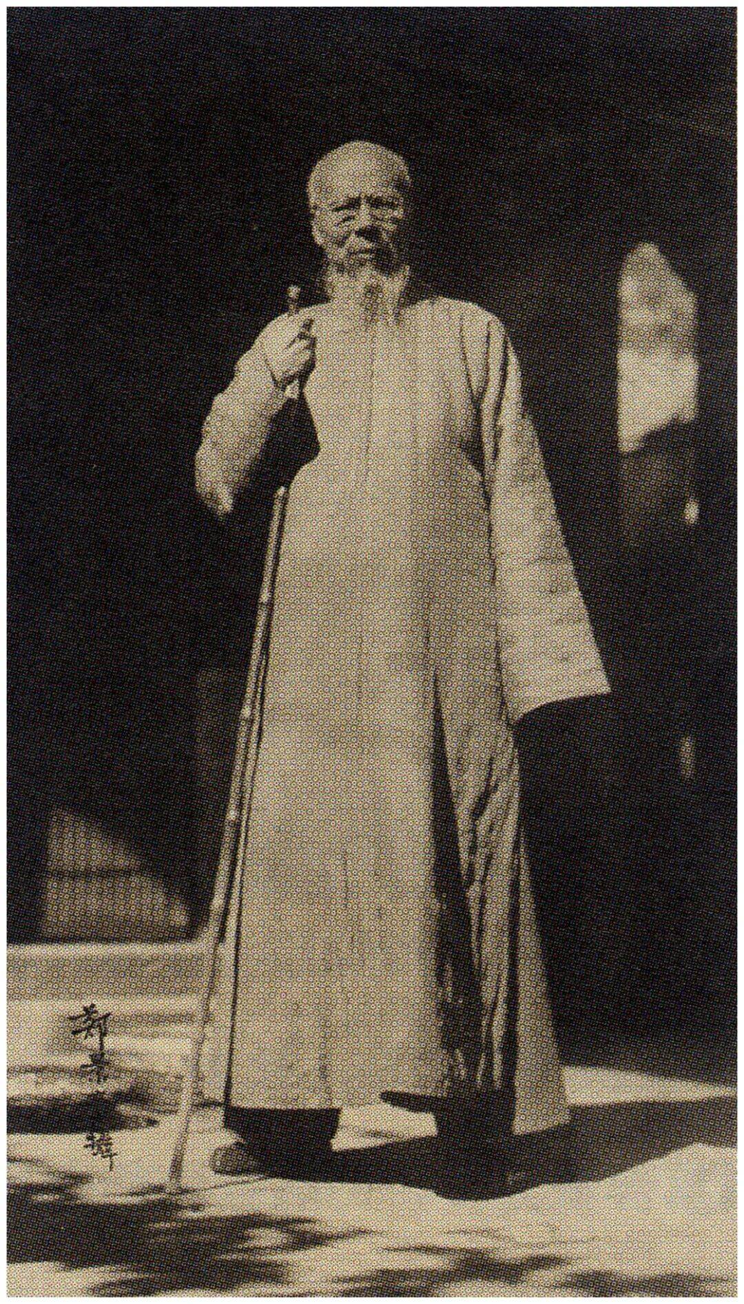 郑景康为老人拍摄的照片如今可见3张,以下择其二作说明。一张是胸像,一张是全身照,焦点是齐白石拄着拐杖。照片中的齐白石穿着棉袍,身体右倾,目视前方而神情哀苦,右手拄着一根笔直的竹杖——区别于十年后的红漆藤杖。