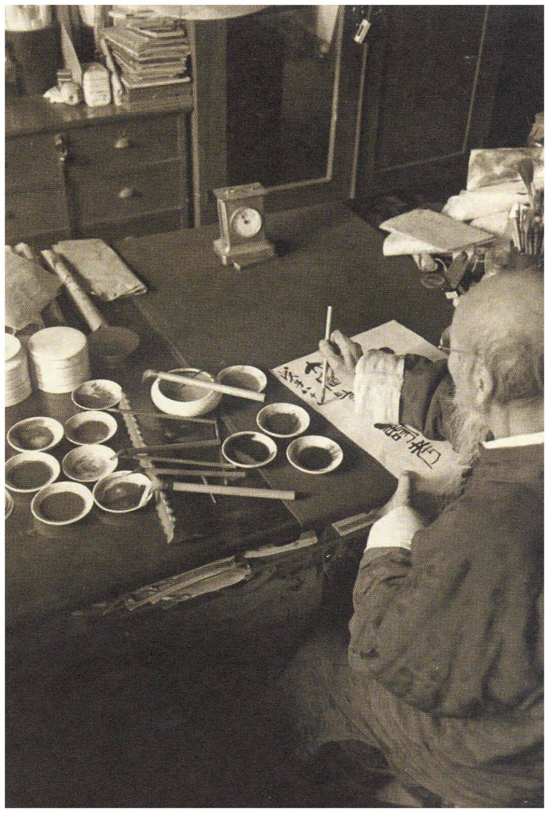 即便到了1948年杰克·伯恩斯为之拍照时依旧如此,而画室里物品摆放凌乱,但颜料碟、笔洗里十分干净,这些都是其画作中色、墨明净的原因所在。