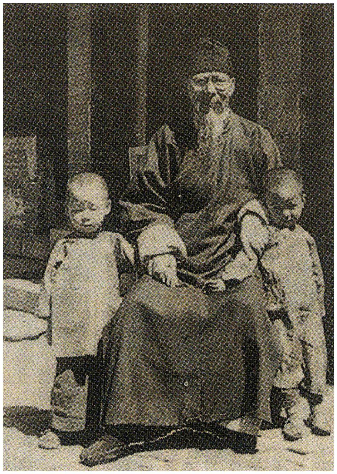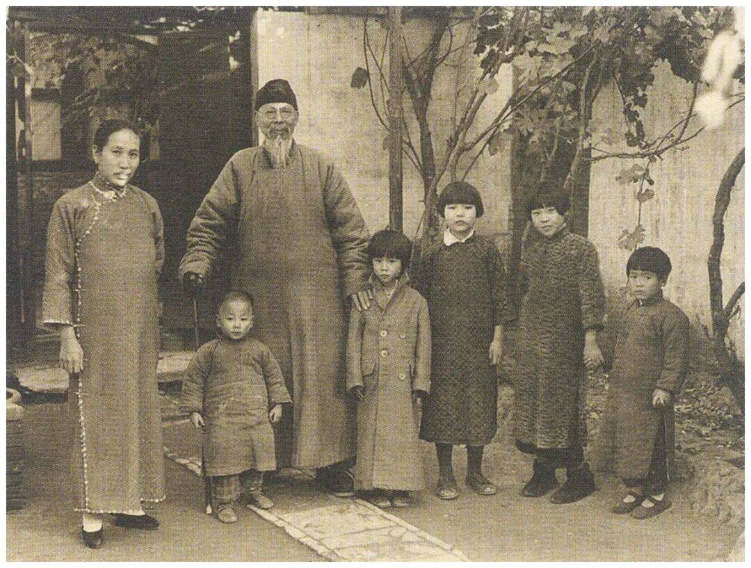 (左起)齐阿梅(存疑)、齐良年、齐白石、齐良止、齐良怜、齐良欢、齐曲珠(存疑),1937年秋月,赫达·莫理循拍摄